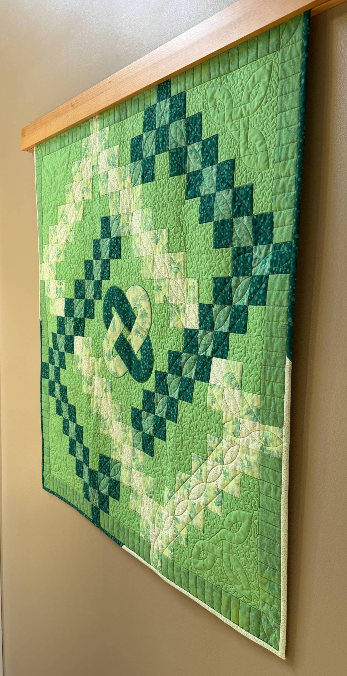 I'm thinking about doing another one but with wider chains and maybe not have the appliqué in the center. That appliqué is a little puffy because I didn't want to quilt over it with the stiff backing in case I ended up with permanent needle holes.